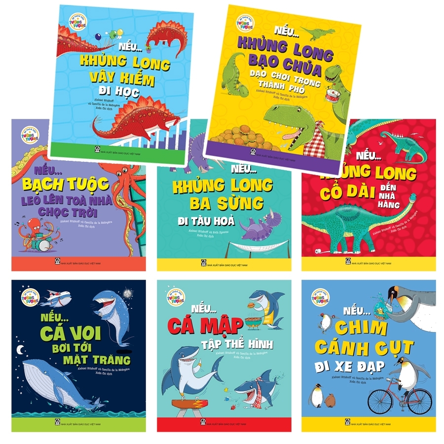 - Cuốn Nếu... khủng long vây kiếm đi học: Hãy tưởng tượng, nếu khủng long vây kiếm còn sống tới ngày nay, chắc chắn, bé sẽ vô cùng bất ngờ khi phát hiện ra cậu ấy: nếu đi học, chắc sẽ không theo kịp các bạn trong lớp đâu, nếu vào siêu thị thì sẽ phát hiện ra ngay những trái cây thơm ngon từ rất xa, nếu đi bộ trên đường phố thì sẽ gây tắc đường kinh khủng… Và còn bao nhiêu điều kinh ngạc khác về khủng long vây kiếm đang chờ bé khám phá!