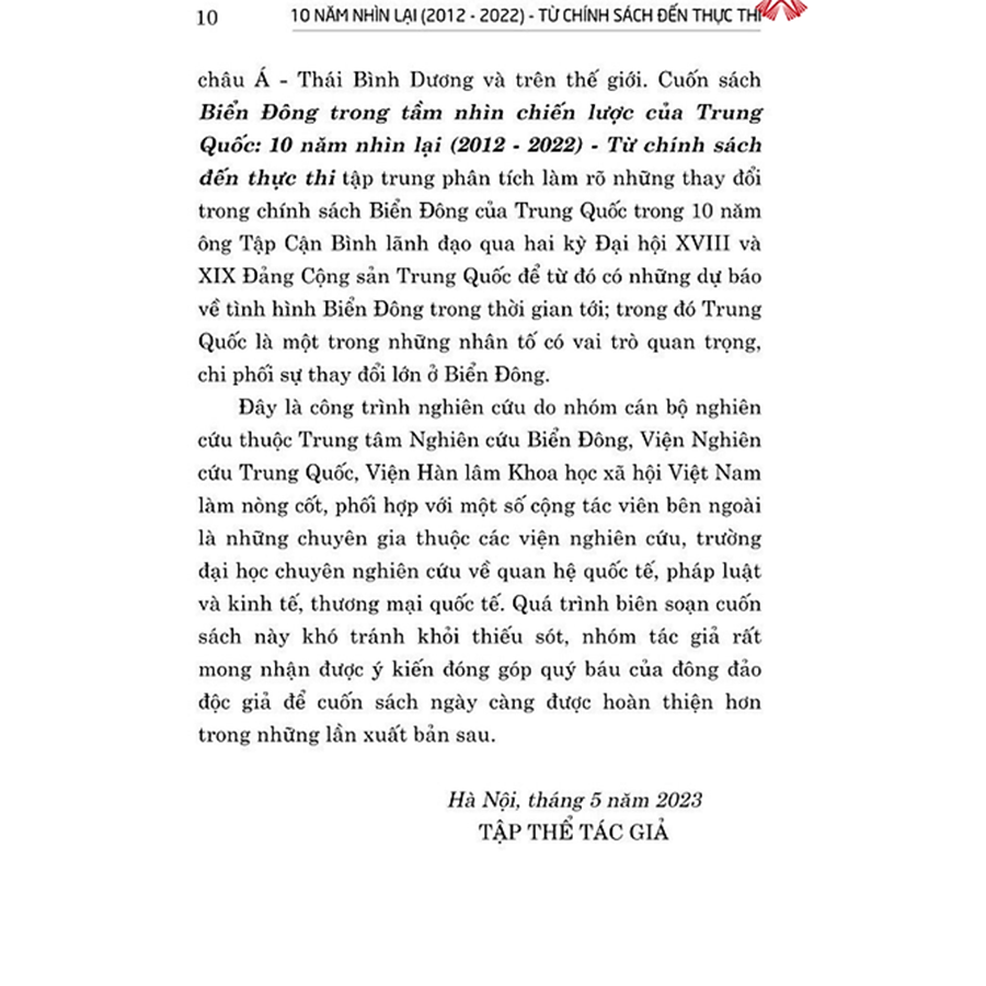 Để giúp độc giả có được cách nhìn khái quát, toàn diện về vai trò, vị trí của Biển Đông trong các mục tiêu chiến lược lớn của Trung Quốc trong suốt 10 năm (2012 - 2022), kể từ Đại hội XVIII dưới sự cầm quyền của thế hệ lãnh đạo thứ năm của Đảng Cộng sản Trung Quốc mà hạt nhân là ông Tổng Bí thư, Chủ tịch nước Tập Cận Bình đến nay, Nhà xuất bản Chính trị quốc gia Sự thật xuất bản cuốn sách Biển Đông trong tầm nhìn chiến lược của Trung Quốc: 10 năm nhìn lại (2012 - 2022) - Từ chính sách đến thực thi do TS. Bùi Thị Thu Hiền - Giám đốc Trung tâm Nghiên cứu Biển Đông, Viện Nghiên cứu Trung Quốc, Viện Hàn lâm Khoa học xã hội Việt Nam làm chủ biên.