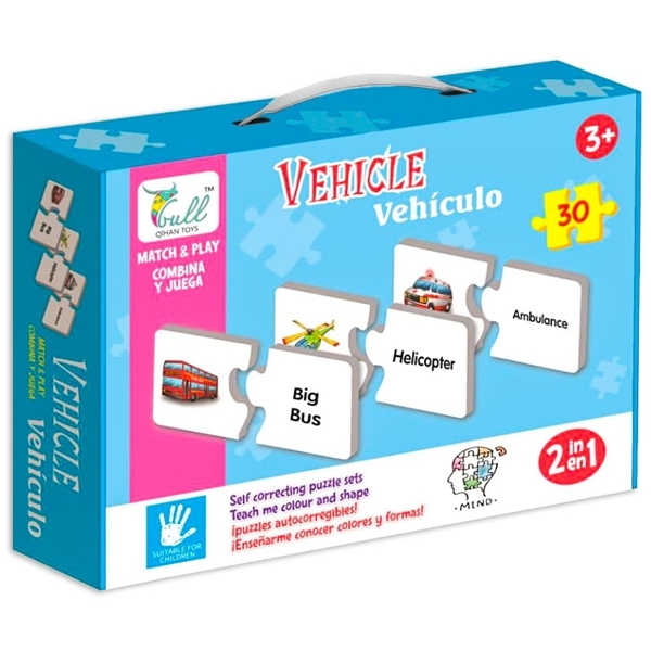 Gồm 30 bộ mảnh ghép đôi chia đều thành 30 mảnh ghép in chữ và 30 mảnh ghép in hình ảnh tương ứng về chủ đề “Phương tiện giao thông”. Nhiệm vụ của các bé là ghi nhớ cụm từ và tìm ra mảnh ghép hình ảnh tương ứng với cụm từ đó và ngược lại.