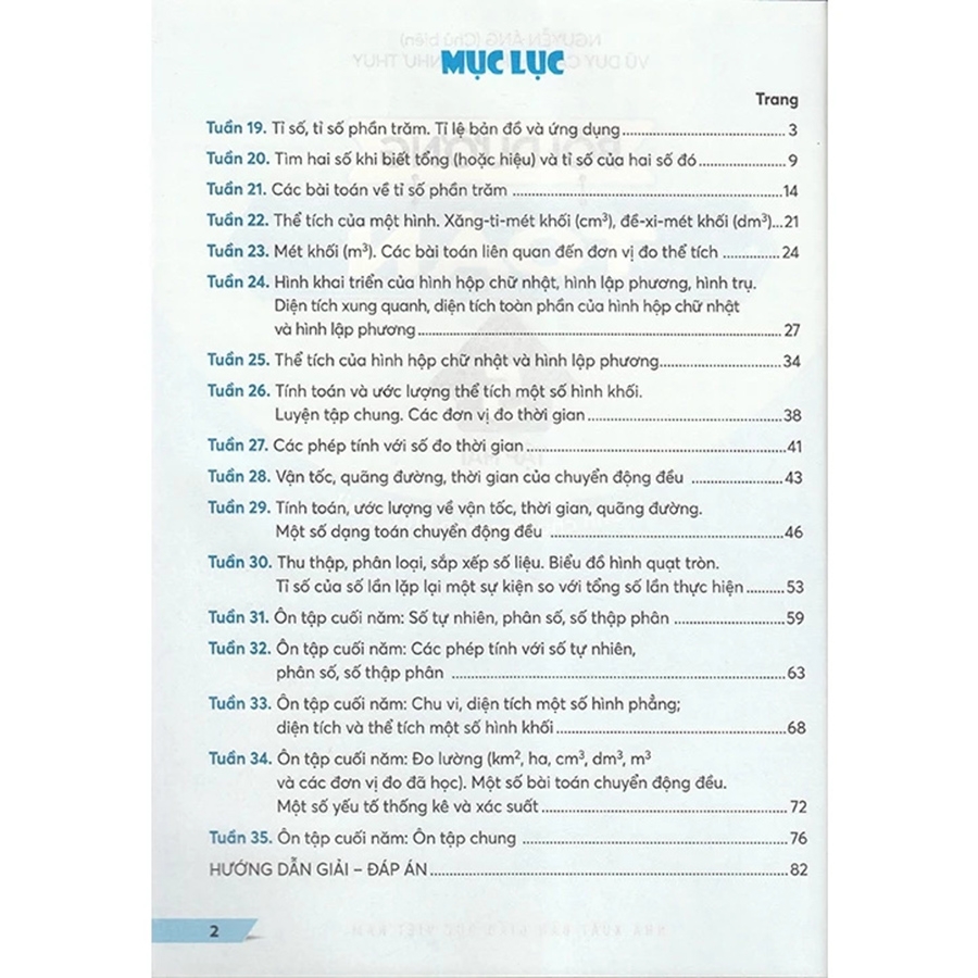 Cuốn sách Bồi dưỡng Toán lớp 5 (dành cho học sinh khá, giỏi) gồm 2 tập, được biên soạn theo từng tuần, ứng với 35 tuần thực học ở lớp 5 và nội dung để bồi dưỡng là nội dung chủ yếu trong tuần thực học đó. Mỗi tuần gồm 8 đến 10 bài tập được sắp xếp, hệ thống theo hướng phát triển năng lực từ mức độ cơ bản, phát triển đến nâng cao dần, phù hợp với nhận thức theo từng giai đoạn của học sinh. Các em học sinh hãy cố gắng tự mình giải quyết các bài tập để qua đó rèn luyện, phát triển tư duy độc lập, sáng tạo của mình.