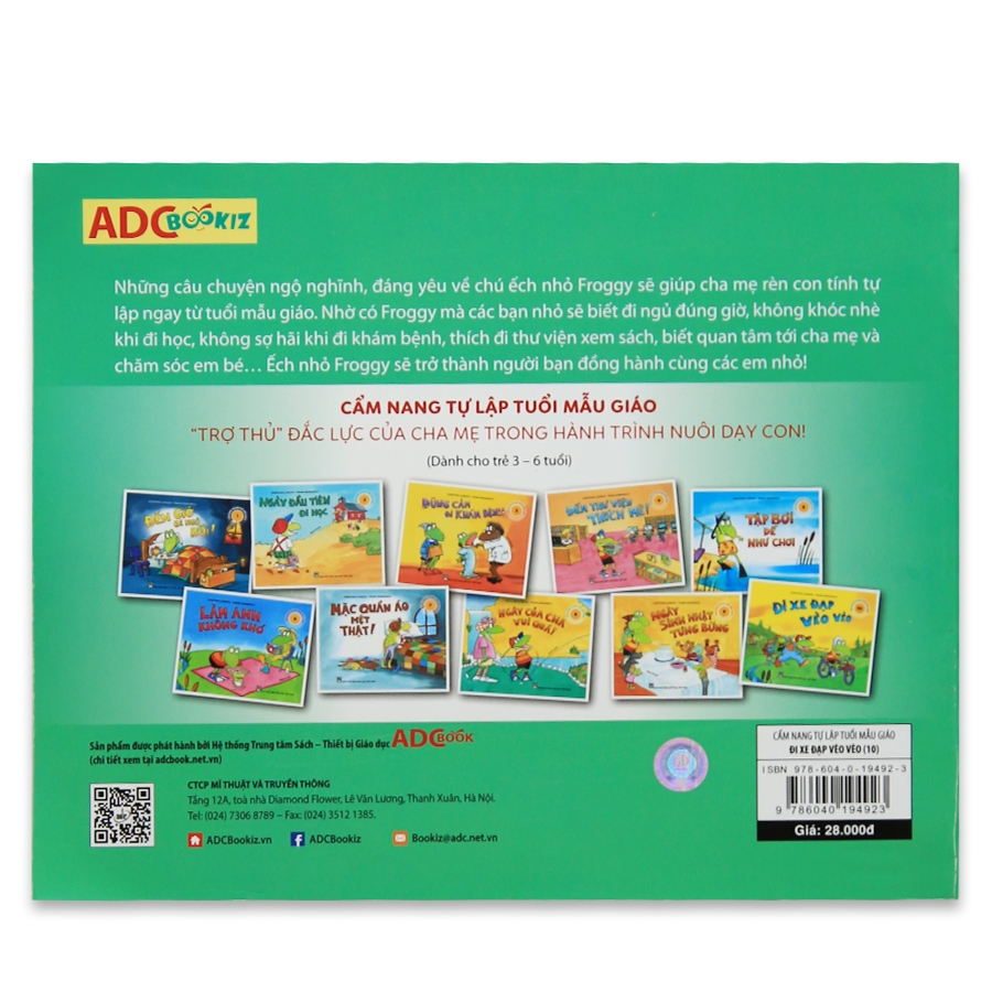 “Cẩm nang tự lập tuổi mẫu giáo” dành cho các bạn nhỏ từ 3 – 6 tuổi, gồm những câu chuyện ngộ nghĩnh, đáng yêu về chú ếch nhỏ Froggy sẽ giúp cha mẹ rèn con tính tự lập ngay từ nhỏ. Nhờ có Froggy mà các bạn nhỏ sẽ đi ngủ đúng giờ, không khóc nhè khi đi học, không sợ hãi khi đi khám bệnh, thích đi thư viện đọc sách, biết quan tâm tới cha mẹ và chăm sóc em bé… Ếch nhỏ Froggy sẽ trở thành người bạn đồng hành cùng các em nhỏ.