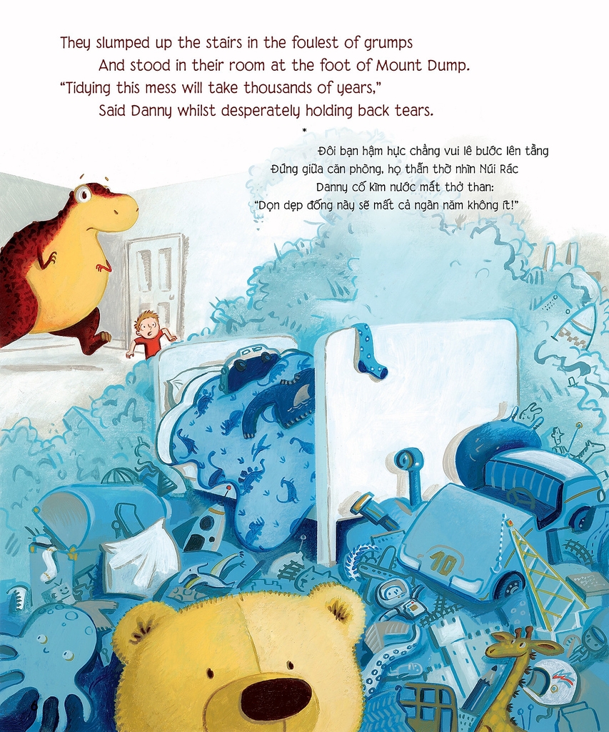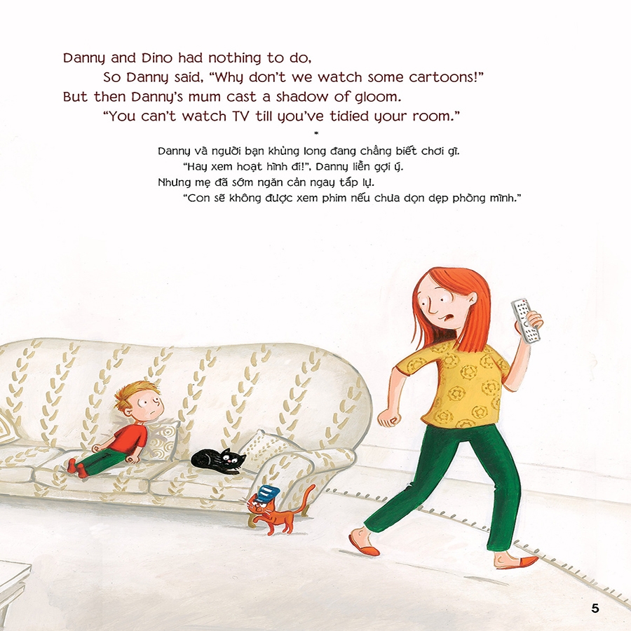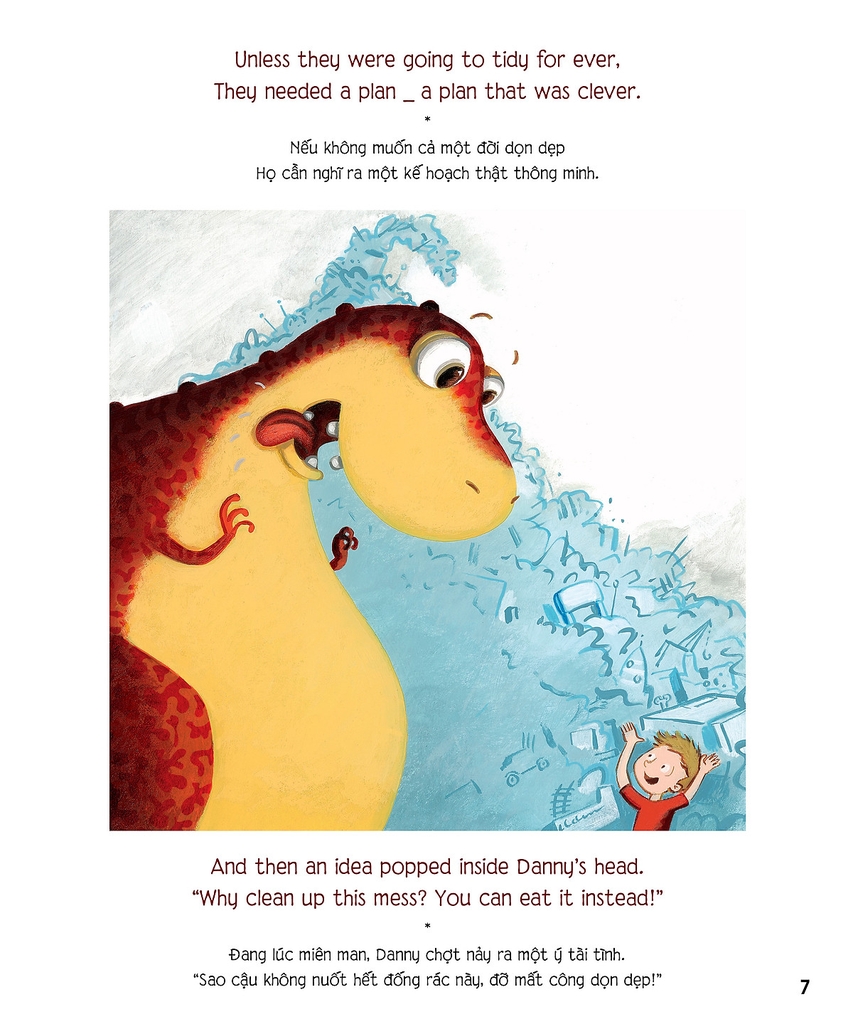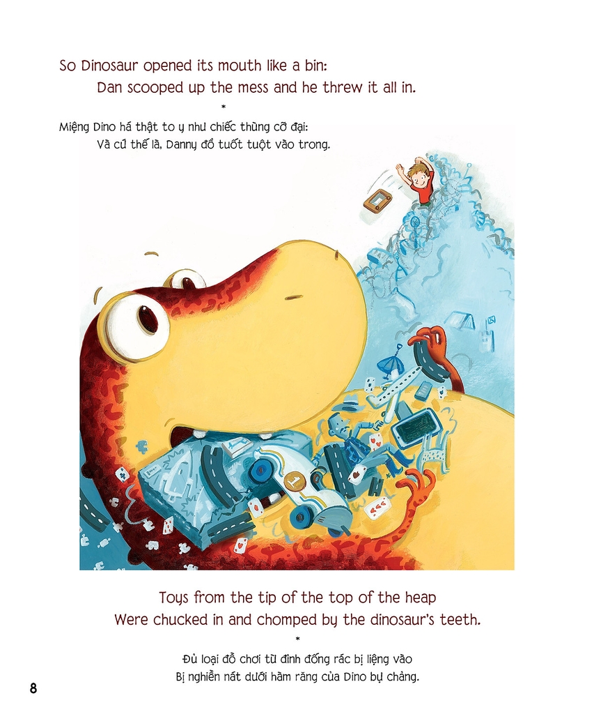 Chú khủng long tham ăn gồm 6 cuốn SONG NGỮ dành cho lứa tuổi mẫu giáo và tiểu học (2-8 TUỔI) là thế giới đầy sắc màu của đôi bạn thân Danny và chú khủng long Dino dễ thương nhưng háu ăn. Hễ đói, chú ăn tất tật mọi thứ trong tầm mắt, từ chiếc giường, nàng công chúa, bố, mẹ, bà, ngôi nhà đang ở, cầu vồng và thậm chí cả một hành tinh khổng lồ. Nhưng ăn xong, cậu đều hối hận vô cùng và đều rút ra được bài học cho bản thân. Cuối cùng, để sửa chữa sai lầm, cậu quyết định ị ra trả lại mọi thứ nguyên vẹn.