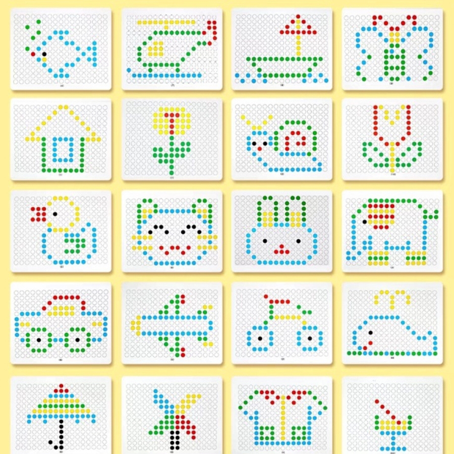Trong 1 bộ gồm: 10 tấm card, 20 mẫu vẽ sẵn, 1 bảng nam châm, 1 bút nam châm, và những nút nam châm đủ màu sắc.