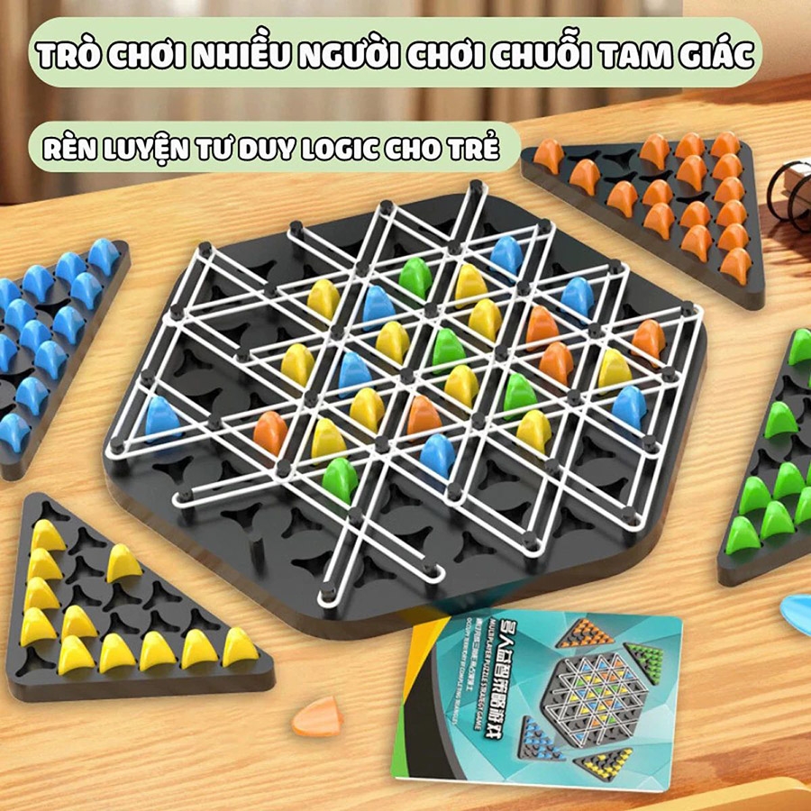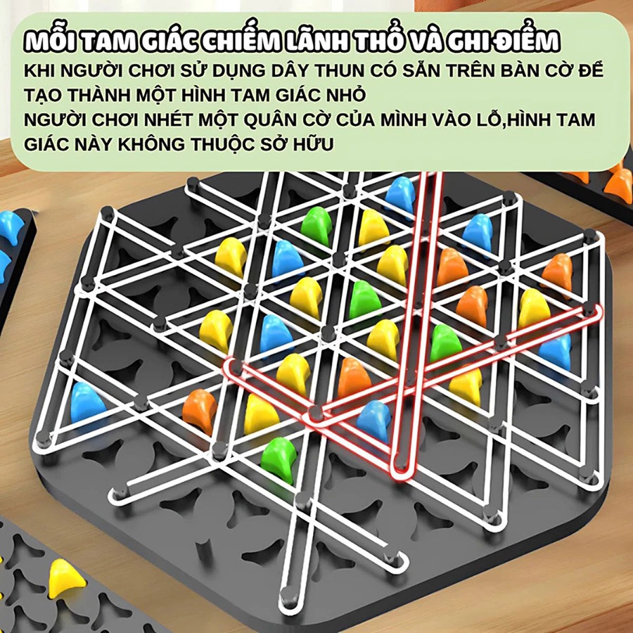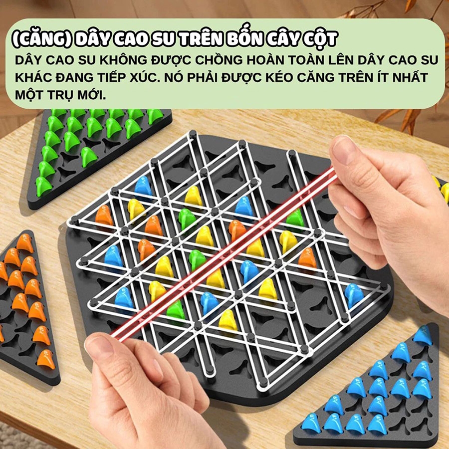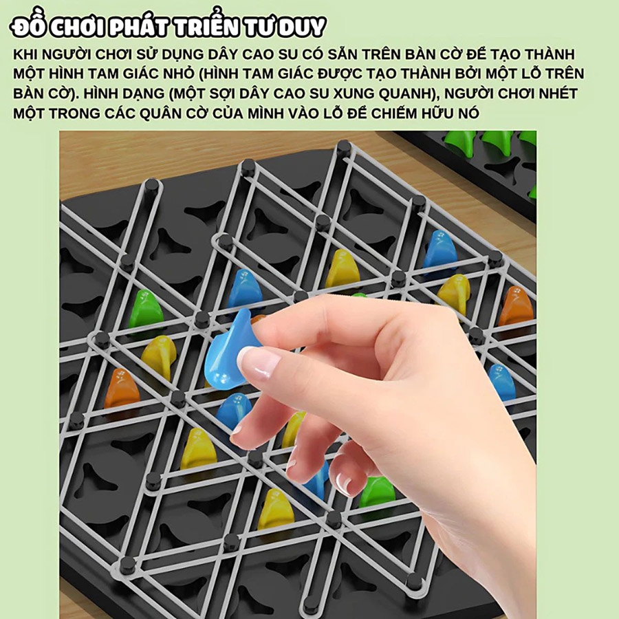 - Giúp bé rèn luyện tư duy logic: Bé sẽ phải suy nghĩ để tìm ra cách ghép dây chun thành tam giác hoàn chỉnh trên Bàn cờ.