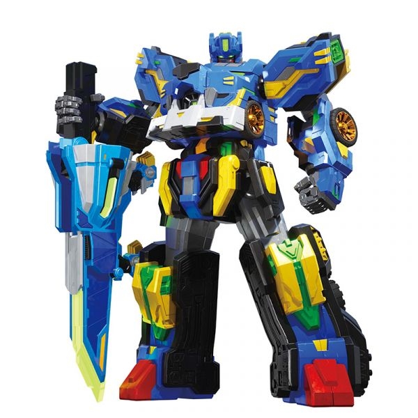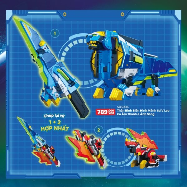 Bộ đồ chơi mô phỏng theo Thiên Kiếm Mãnh sư Leo V từ bộ phim Miniforce V - Biệt đội siêu nhân nhí- phần Chiến binh rừng xanh. Bộ đồ chơi có thể biến hình từ thần binh sang mãnh sư V Leo, ấn nút, kích hoạt chìa khóa vạn năng, mãnh sư đã có đèn & âm thanh tuyệt đỉnh.