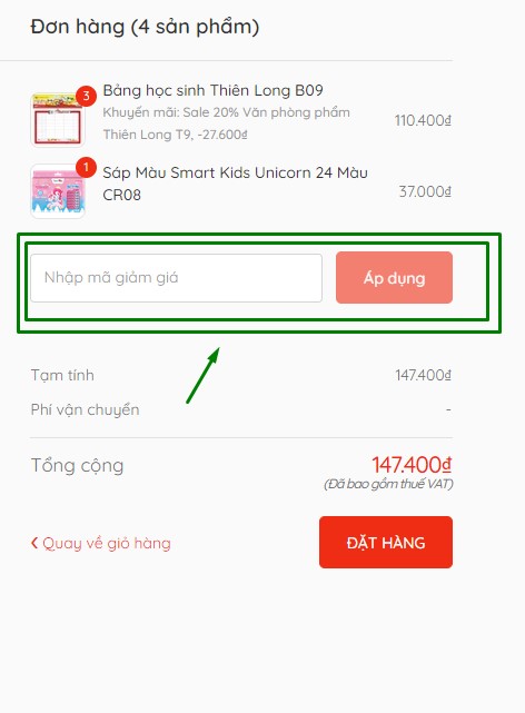 - Mã giảm giá: Quý khách vui lòng nhập mã giảm giá và bấm "Áp dụng", hệ thống sẽ hiển thị số tiền được giảm của đơn hàng/sản phẩm.