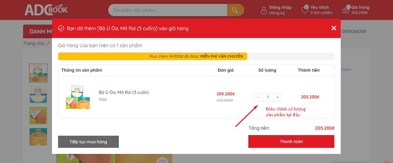- Quý khách có thể điều chỉnh số lượng sản phẩm hoặc tiếp tục mua hàng để được hưởng chính sách miễn phí vận chuyển của ADCBook.