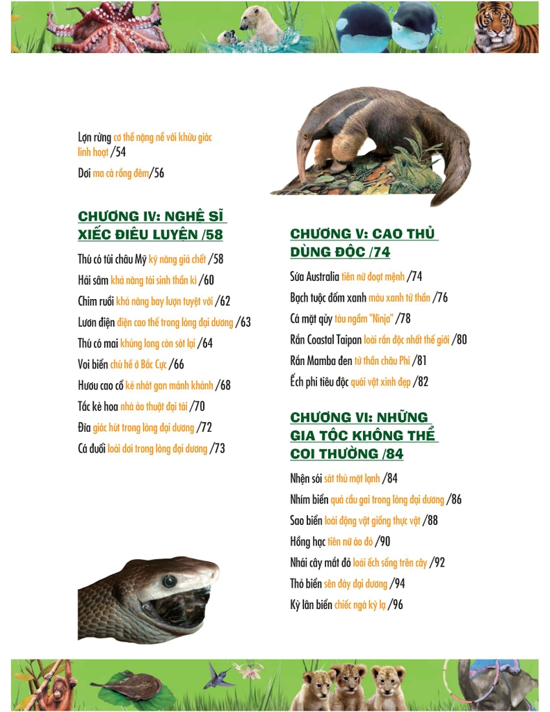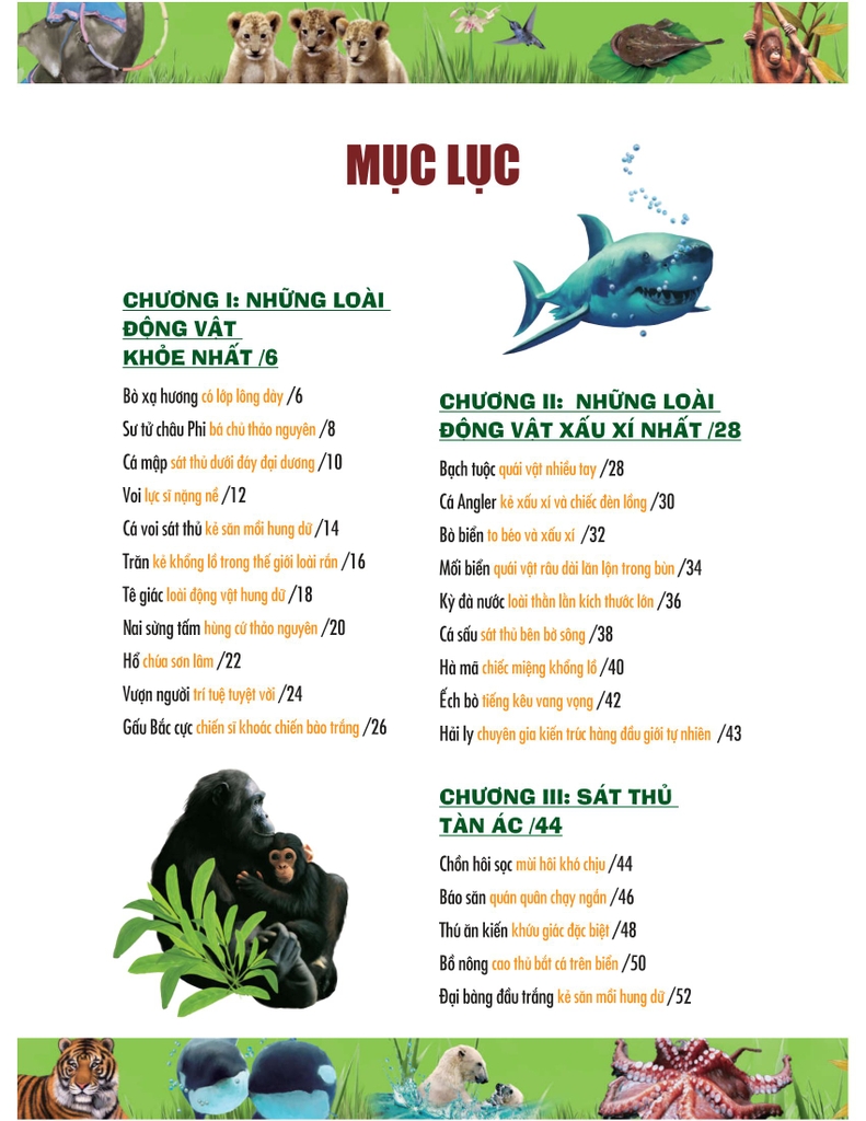 Cuốn sách này sử dụng những bức tranh sinh động và ngôn ngữ hài hước để giới thiệu với các bạn về đặc điểm inh hoạt, khả năng sinh tồn, những nét nổi bật của những loài động vật khỏe nhất, xấu xí nhất, tàn nhẫn nhất, nguy hiểm nhất, hung dữ nhất và kì diệu nhất… Cuốn sách sẽ cung cấp những kiến thức giúp chúng ta hiểu biết thêm về những loài động vật..