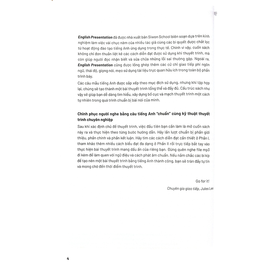 + Cung cấp các câu mẫu bằng tiếng Anh theo từng bước, có thể áp dụng trong nhiều bối cảnh thuyết trình khác nhau;