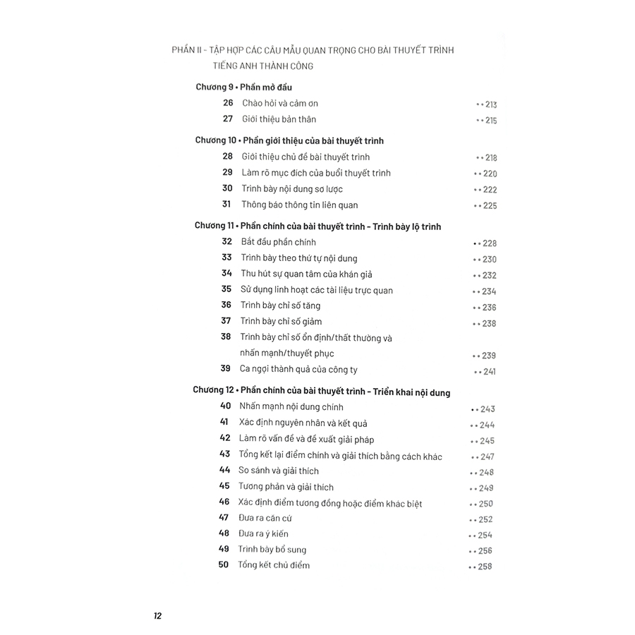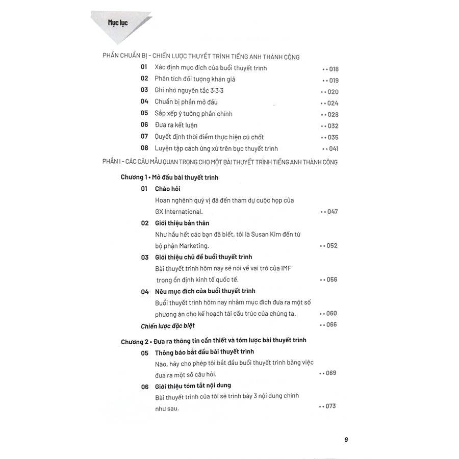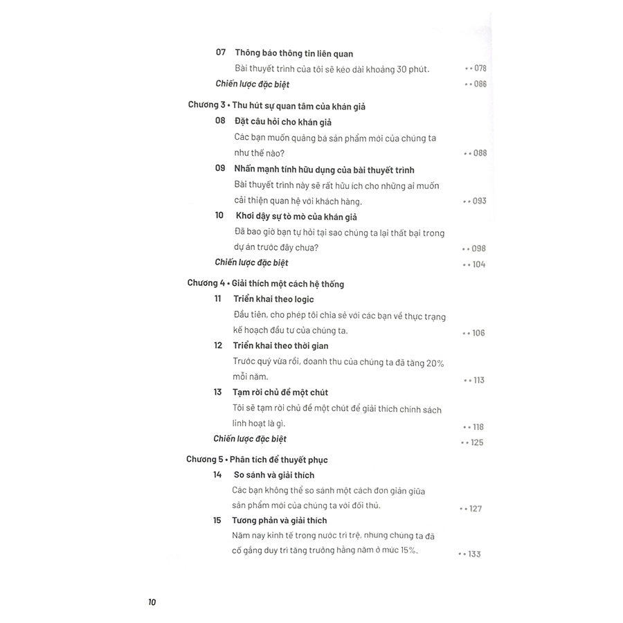 Ở ngay phần đầu, cuốn sách cung cấp các mẹo hữu ích cho người học tự chuẩn bị bài thuyết trình. Sau 3-4 bài học, các tác giả bổ sung thêm phần “Chiến lược đặc biệt” do các chuyên gia khuyến nghị, giúp người thuyết trình tăng độ thu hút cho bài nói.