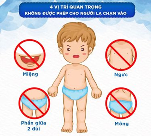- Dạy con về "vùng riêng tư": Giải thích cho trẻ biết rằng những bộ phận như miệng, ngực, bộ phận sinh dục là vùng riêng tư, không ai được phép động vào.